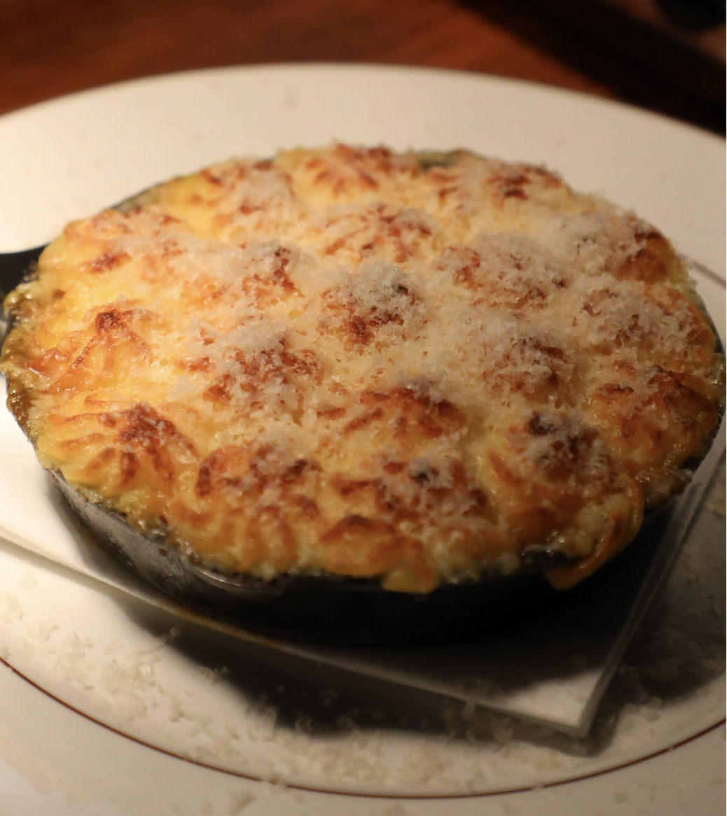 Spoon on top of the chilled meat mix and chill until required. Cook in a preheated 200-degree fan oven for approximately 40 minutes or until golden brown and piping hot in the centre. Finish with freshly grated parmesan.